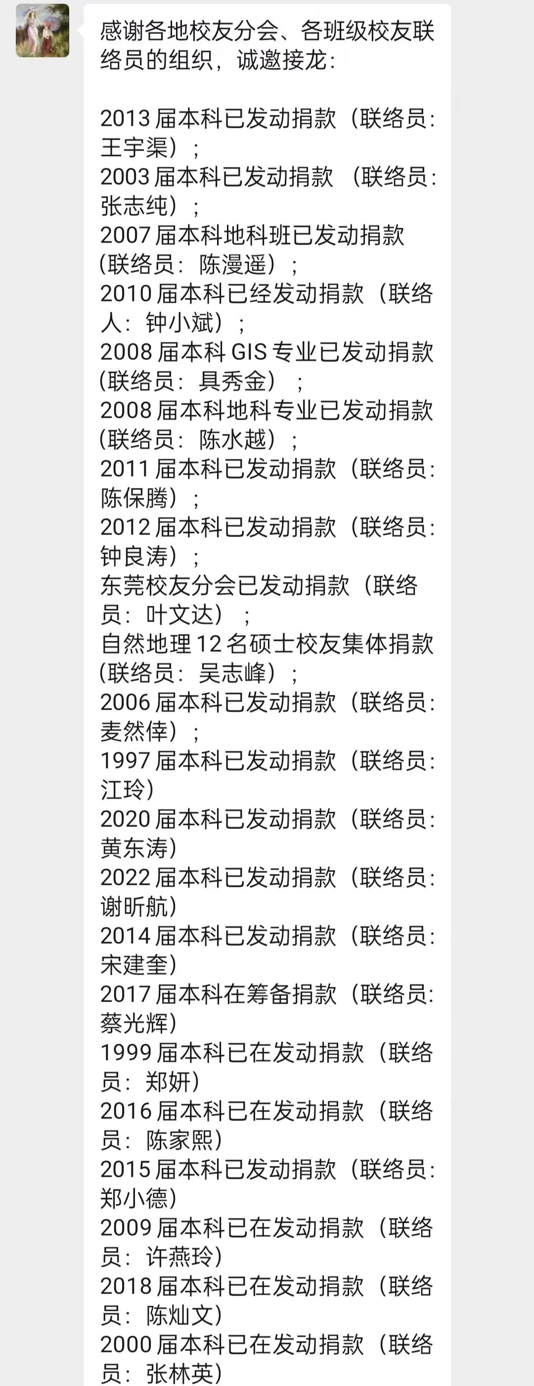 看到昔日的同学们齐心协力,尽己所能默默捐款,为学院建设出一份力,廖敏玲感触颇深。“特别怀念大学的学习生活,怀念恩师们的课堂、关切与厚爱、怀念一起外出考察艰苦奋战的同学、怀念绿皮车箱里不舍昼夜的‘拖拉机’、怀念地理系楼顶一起期待“流星雨”、怀念一直传承至今的属于地理人的‘迎新晚会’……” 虽然大家毕业各奔东西,但是从未走远。正如陈勇杰所说,是满满的爱让大家凝成了一股劲,毕业多年仍然如当年那样活跃。